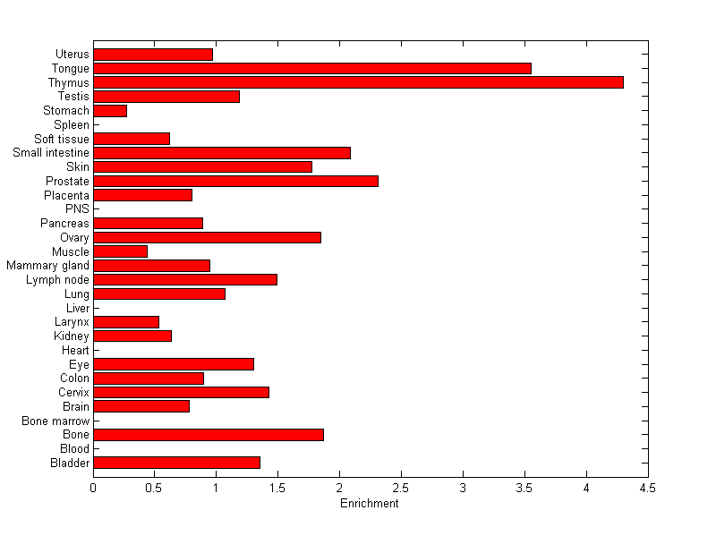 The expression level is normalized with tissue-library size. Each value for a gene in a tissue is a ratio of observed ESTs to the expected one in this tissue. The expected number of ESTs is the product of total ESTs of the gene and the fraction of total ESTs in the tissue among all ESTs in 30 tissues.