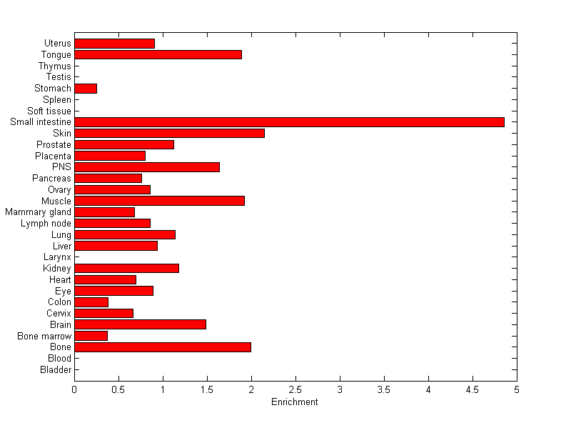 The expression level is normalized with tissue-library size. Each value for a gene in a tissue is a ratio of observed ESTs to the expected one in this tissue. The expected number of ESTs is the product of total ESTs of the gene and the fraction of total ESTs in the tissue among all ESTs in 30 tissues.