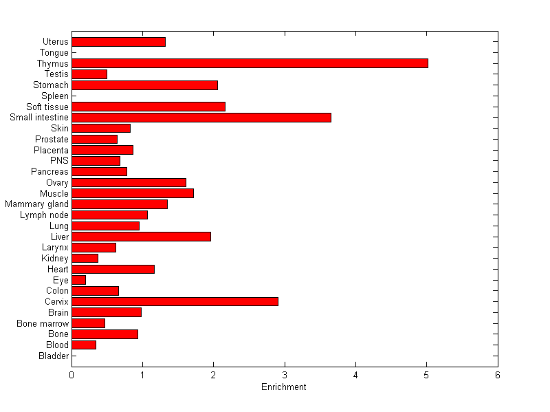 The expression level is normalized with tissue-library size. Each value for a gene in a tissue is a ratio of observed ESTs to the expected one in this tissue. The expected number of ESTs is the product of total ESTs of the gene and the fraction of total ESTs in the tissue among all ESTs in 30 tissues.