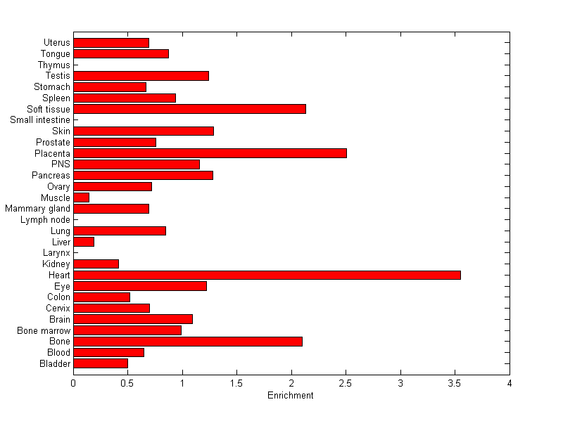 The expression level is normalized with tissue-library size. Each value for a gene in a tissue is a ratio of observed ESTs to the expected one in this tissue. The expected number of ESTs is the product of total ESTs of the gene and the fraction of total ESTs in the tissue among all ESTs in 30 tissues.