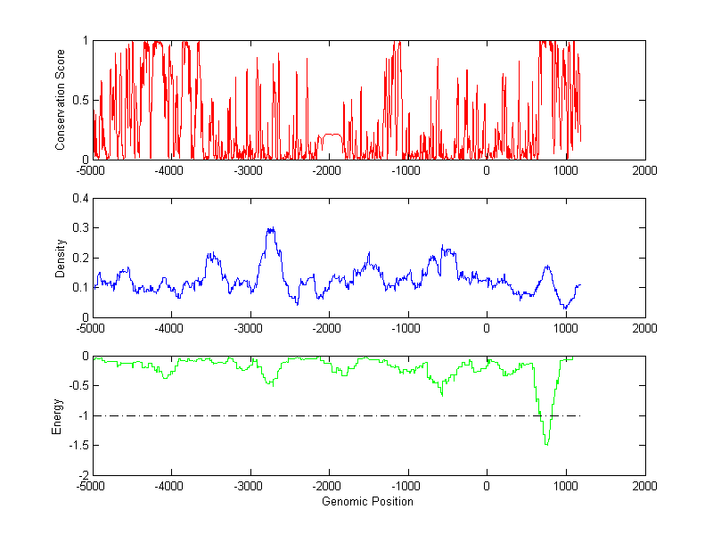 The energy profile (green curve) is about energy for module detection based on TF interaction. The positions with energy less than -1 indicate the existence of CRMs.