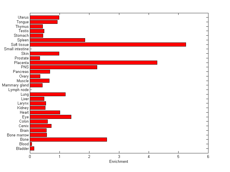 The expression level is normalized with tissue-library size. Each value for a gene in a tissue is a ratio of observed ESTs to the expected one in this tissue. The expected number of ESTs is the product of total ESTs of the gene and the fraction of total ESTs in the tissue among all ESTs in 30 tissues.