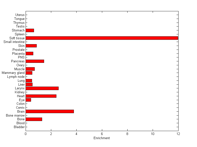 The expression level is normalized with tissue-library size. Each value for a gene in a tissue is a ratio of observed ESTs to the expected one in this tissue. The expected number of ESTs is the product of total ESTs of the gene and the fraction of total ESTs in the tissue among all ESTs in 30 tissues.