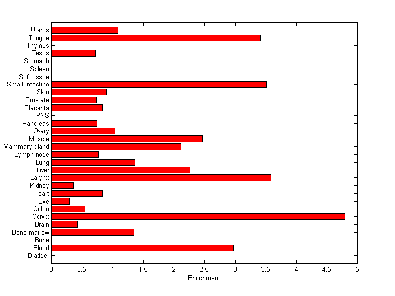 The expression level is normalized with tissue-library size. Each value for a gene in a tissue is a ratio of observed ESTs to the expected one in this tissue. The expected number of ESTs is the product of total ESTs of the gene and the fraction of total ESTs in the tissue among all ESTs in 30 tissues.