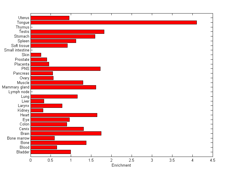 The expression level is normalized with tissue-library size. Each value for a gene in a tissue is a ratio of observed ESTs to the expected one in this tissue. The expected number of ESTs is the product of total ESTs of the gene and the fraction of total ESTs in the tissue among all ESTs in 30 tissues.