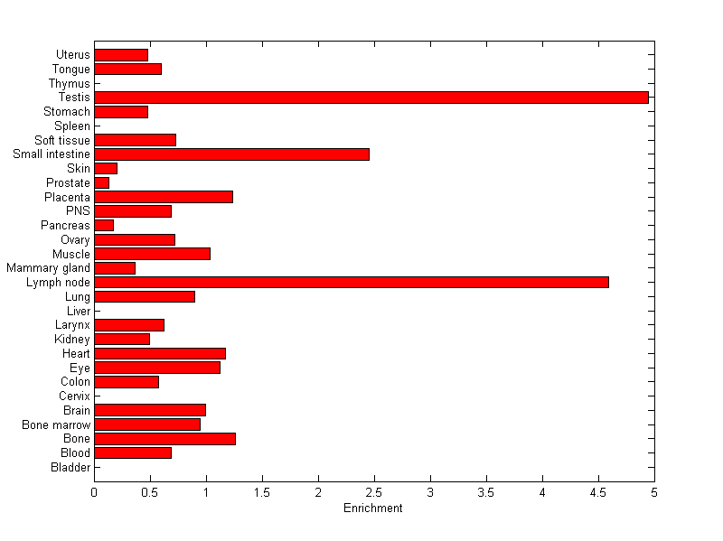 The expression level is normalized with tissue-library size. Each value for a gene in a tissue is a ratio of observed ESTs to the expected one in this tissue. The expected number of ESTs is the product of total ESTs of the gene and the fraction of total ESTs in the tissue among all ESTs in 30 tissues.