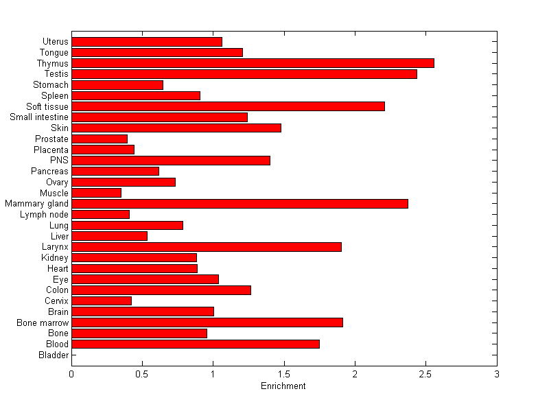 The expression level is normalized with tissue-library size. Each value for a gene in a tissue is a ratio of observed ESTs to the expected one in this tissue. The expected number of ESTs is the product of total ESTs of the gene and the fraction of total ESTs in the tissue among all ESTs in 30 tissues.