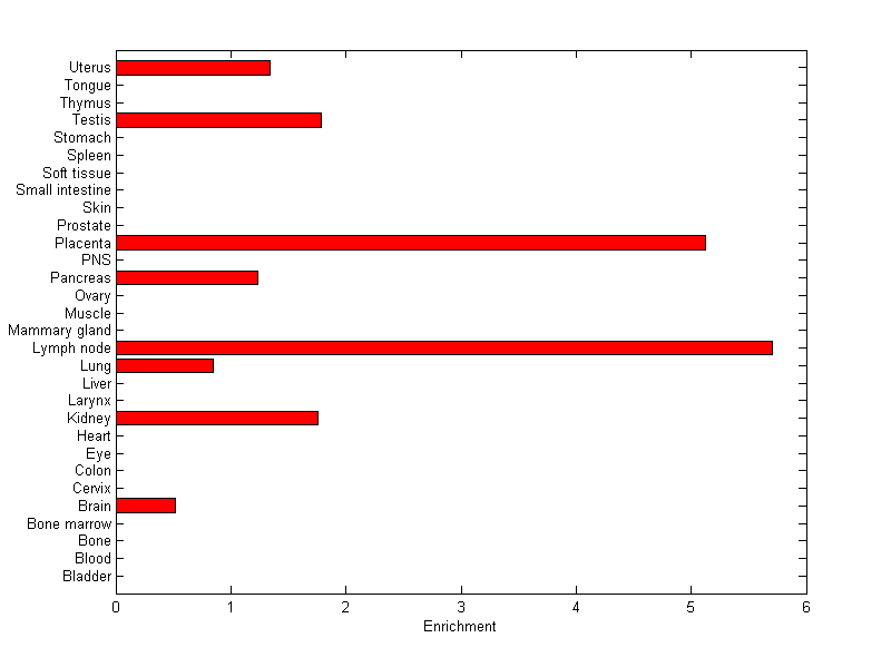 The expression level is normalized with tissue-library size. Each value for a gene in a tissue is a ratio of observed ESTs to the expected one in this tissue. The expected number of ESTs is the product of total ESTs of the gene and the fraction of total ESTs in the tissue among all ESTs in 30 tissues.