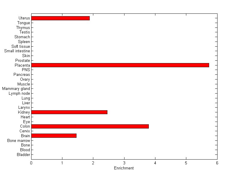 The expression level is normalized with tissue-library size. Each value for a gene in a tissue is a ratio of observed ESTs to the expected one in this tissue. The expected number of ESTs is the product of total ESTs of the gene and the fraction of total ESTs in the tissue among all ESTs in 30 tissues.