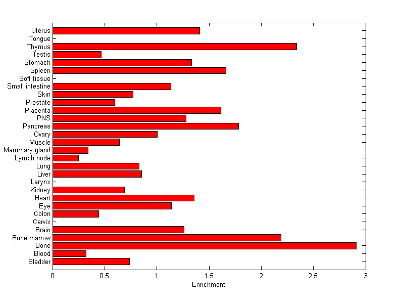 The expression level is normalized with tissue-library size. Each value for a gene in a tissue is a ratio of observed ESTs to the expected one in this tissue. The expected number of ESTs is the product of total ESTs of the gene and the fraction of total ESTs in the tissue among all ESTs in 30 tissues.