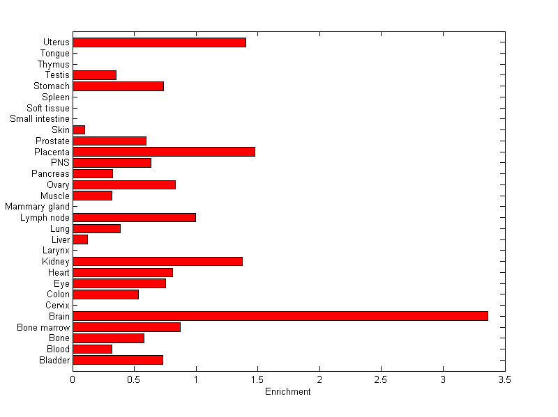 The expression level is normalized with tissue-library size. Each value for a gene in a tissue is a ratio of observed ESTs to the expected one in this tissue. The expected number of ESTs is the product of total ESTs of the gene and the fraction of total ESTs in the tissue among all ESTs in 30 tissues.