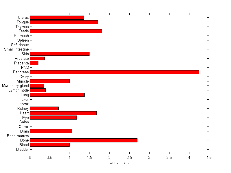 The expression level is normalized with tissue-library size. Each value for a gene in a tissue is a ratio of observed ESTs to the expected one in this tissue. The expected number of ESTs is the product of total ESTs of the gene and the fraction of total ESTs in the tissue among all ESTs in 30 tissues.