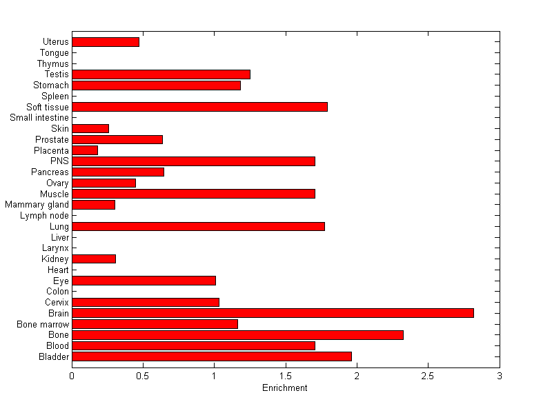 The expression level is normalized with tissue-library size. Each value for a gene in a tissue is a ratio of observed ESTs to the expected one in this tissue. The expected number of ESTs is the product of total ESTs of the gene and the fraction of total ESTs in the tissue among all ESTs in 30 tissues.