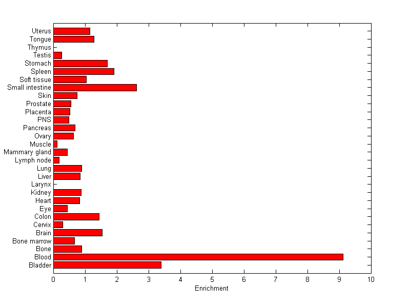 The expression level is normalized with tissue-library size. Each value for a gene in a tissue is a ratio of observed ESTs to the expected one in this tissue. The expected number of ESTs is the product of total ESTs of the gene and the fraction of total ESTs in the tissue among all ESTs in 30 tissues.