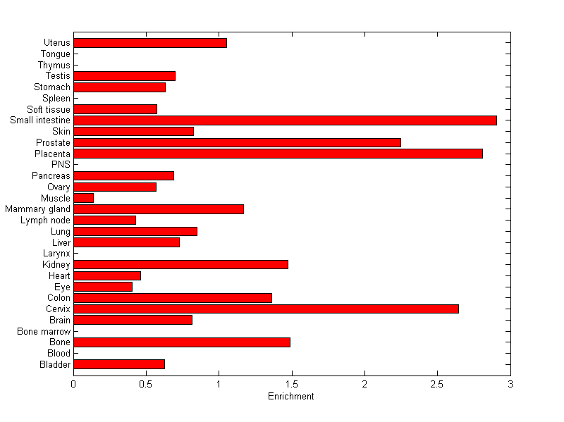 The expression level is normalized with tissue-library size. Each value for a gene in a tissue is a ratio of observed ESTs to the expected one in this tissue. The expected number of ESTs is the product of total ESTs of the gene and the fraction of total ESTs in the tissue among all ESTs in 30 tissues.