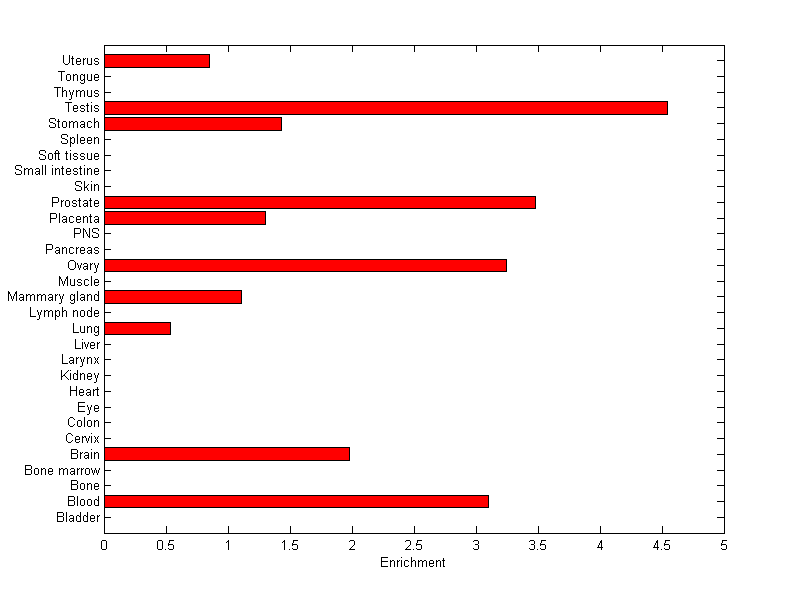 The expression level is normalized with tissue-library size. Each value for a gene in a tissue is a ratio of observed ESTs to the expected one in this tissue. The expected number of ESTs is the product of total ESTs of the gene and the fraction of total ESTs in the tissue among all ESTs in 30 tissues.