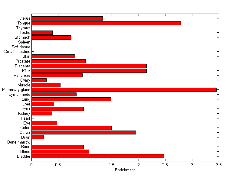 The expression level is normalized with tissue-library size. Each value for a gene in a tissue is a ratio of observed ESTs to the expected one in this tissue. The expected number of ESTs is the product of total ESTs of the gene and the fraction of total ESTs in the tissue among all ESTs in 30 tissues.