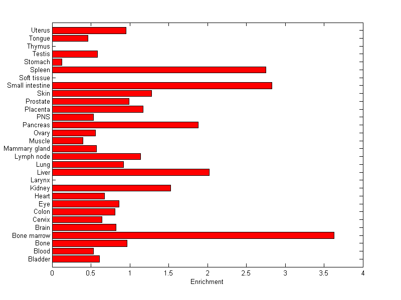 The expression level is normalized with tissue-library size. Each value for a gene in a tissue is a ratio of observed ESTs to the expected one in this tissue. The expected number of ESTs is the product of total ESTs of the gene and the fraction of total ESTs in the tissue among all ESTs in 30 tissues.