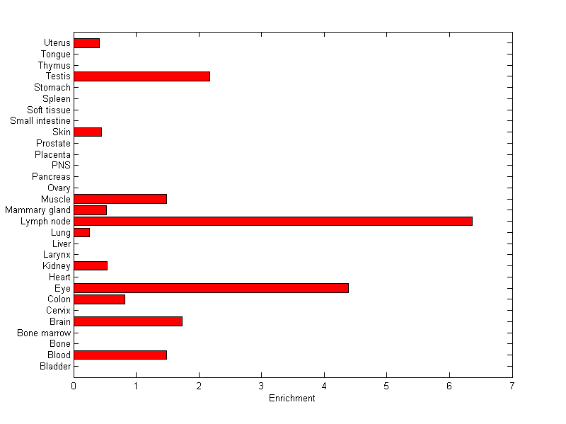 The expression level is normalized with tissue-library size. Each value for a gene in a tissue is a ratio of observed ESTs to the expected one in this tissue. The expected number of ESTs is the product of total ESTs of the gene and the fraction of total ESTs in the tissue among all ESTs in 30 tissues.