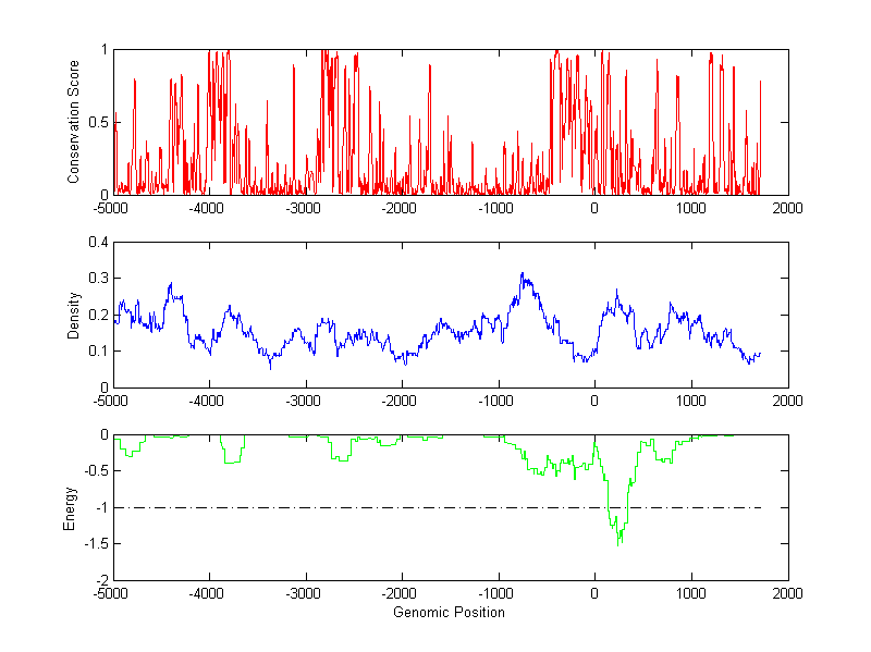 The energy profile (green curve) is about energy for module detection based on TF interaction. The positions with energy less than -1 indicate the existence of CRMs.