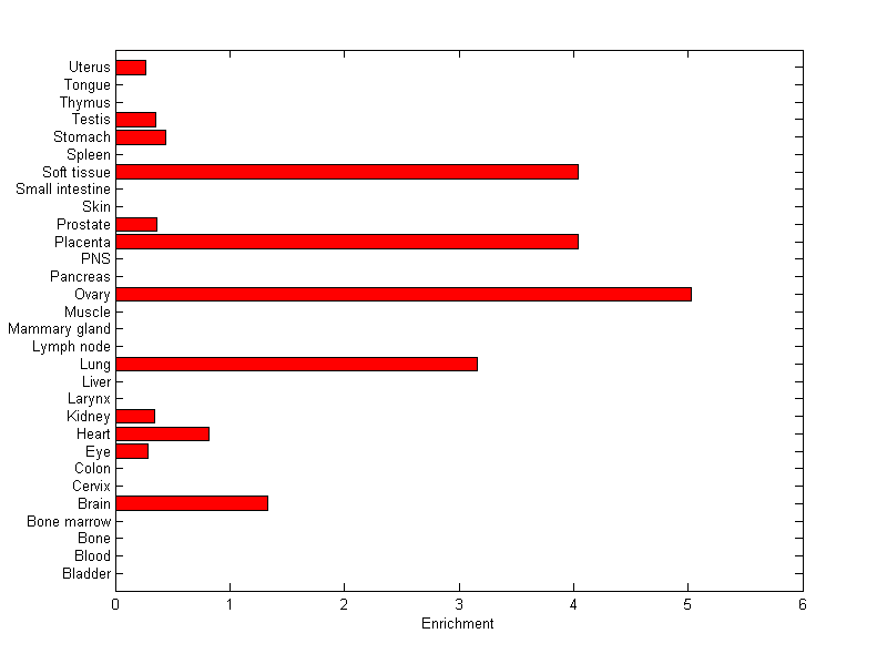 The expression level is normalized with tissue-library size. Each value for a gene in a tissue is a ratio of observed ESTs to the expected one in this tissue. The expected number of ESTs is the product of total ESTs of the gene and the fraction of total ESTs in the tissue among all ESTs in 30 tissues.