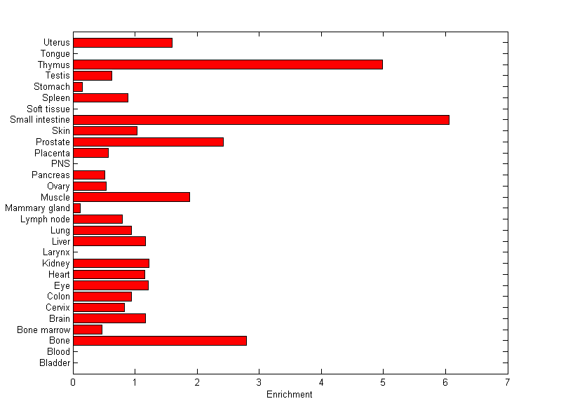The expression level is normalized with tissue-library size. Each value for a gene in a tissue is a ratio of observed ESTs to the expected one in this tissue. The expected number of ESTs is the product of total ESTs of the gene and the fraction of total ESTs in the tissue among all ESTs in 30 tissues.