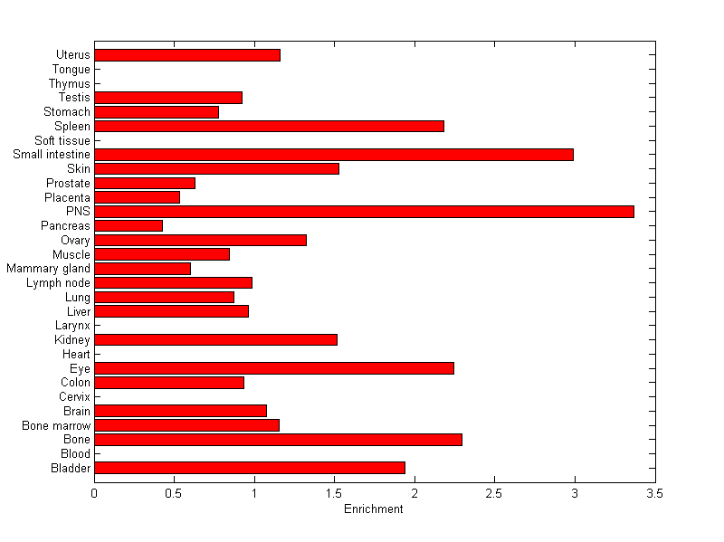 The expression level is normalized with tissue-library size. Each value for a gene in a tissue is a ratio of observed ESTs to the expected one in this tissue. The expected number of ESTs is the product of total ESTs of the gene and the fraction of total ESTs in the tissue among all ESTs in 30 tissues.
