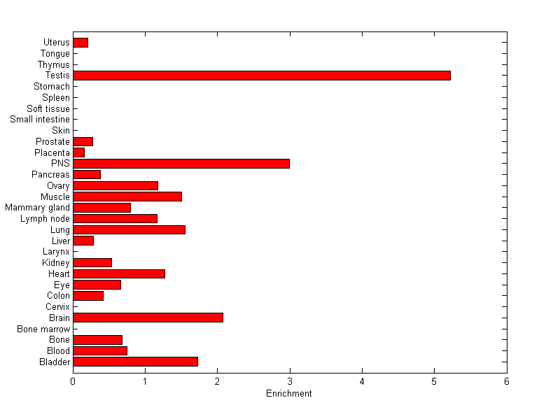 The expression level is normalized with tissue-library size. Each value for a gene in a tissue is a ratio of observed ESTs to the expected one in this tissue. The expected number of ESTs is the product of total ESTs of the gene and the fraction of total ESTs in the tissue among all ESTs in 30 tissues.