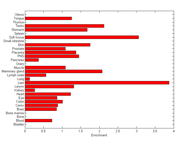 The expression level is normalized with tissue-library size. Each value for a gene in a tissue is a ratio of observed ESTs to the expected one in this tissue. The expected number of ESTs is the product of total ESTs of the gene and the fraction of total ESTs in the tissue among all ESTs in 30 tissues.
