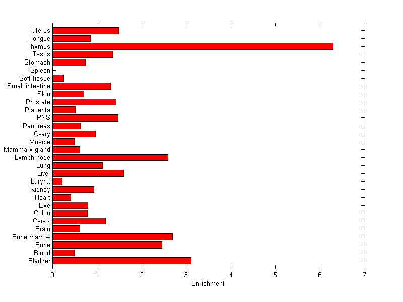 About the profile: The expression level is normalized with tissue-library size. Each value for a gene in a tissue is a ratio of observed ESTs to the expected one in this tissue. The expected number of ESTs is the product of total ESTs of the gene and the fraction of total ESTs in the tissue among all ESTs in 30 tissues. Summary: This gene is preferentially expressed in [thymus] Download: |