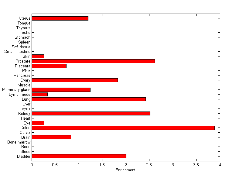 The expression level is normalized with tissue-library size. Each value for a gene in a tissue is a ratio of observed ESTs to the expected one in this tissue. The expected number of ESTs is the product of total ESTs of the gene and the fraction of total ESTs in the tissue among all ESTs in 30 tissues.