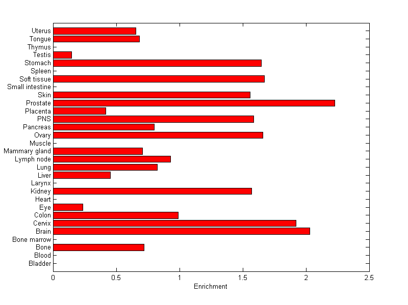 The expression level is normalized with tissue-library size. Each value for a gene in a tissue is a ratio of observed ESTs to the expected one in this tissue. The expected number of ESTs is the product of total ESTs of the gene and the fraction of total ESTs in the tissue among all ESTs in 30 tissues.