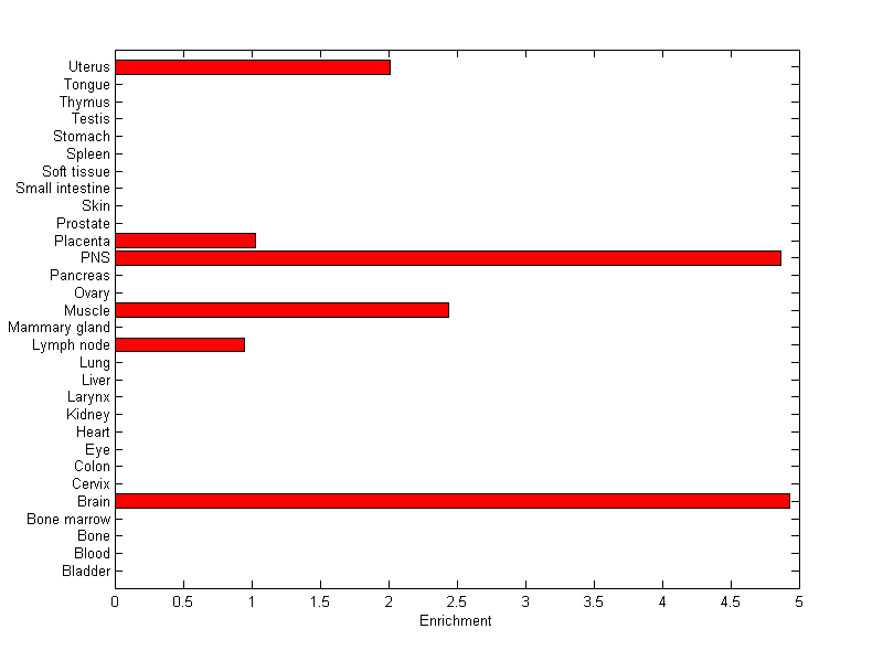 The expression level is normalized with tissue-library size. Each value for a gene in a tissue is a ratio of observed ESTs to the expected one in this tissue. The expected number of ESTs is the product of total ESTs of the gene and the fraction of total ESTs in the tissue among all ESTs in 30 tissues.