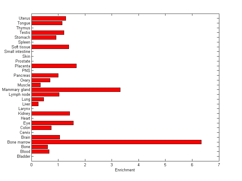 The expression level is normalized with tissue-library size. Each value for a gene in a tissue is a ratio of observed ESTs to the expected one in this tissue. The expected number of ESTs is the product of total ESTs of the gene and the fraction of total ESTs in the tissue among all ESTs in 30 tissues.