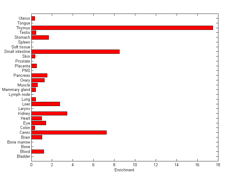 The expression level is normalized with tissue-library size. Each value for a gene in a tissue is a ratio of observed ESTs to the expected one in this tissue. The expected number of ESTs is the product of total ESTs of the gene and the fraction of total ESTs in the tissue among all ESTs in 30 tissues.