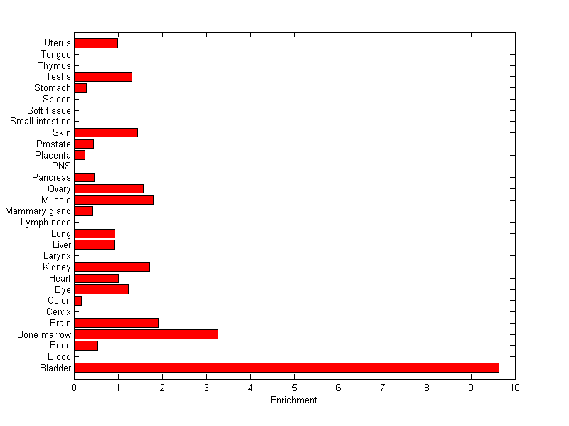 The expression level is normalized with tissue-library size. Each value for a gene in a tissue is a ratio of observed ESTs to the expected one in this tissue. The expected number of ESTs is the product of total ESTs of the gene and the fraction of total ESTs in the tissue among all ESTs in 30 tissues.