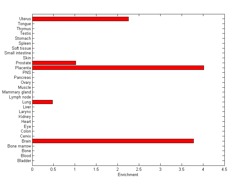 The expression level is normalized with tissue-library size. Each value for a gene in a tissue is a ratio of observed ESTs to the expected one in this tissue. The expected number of ESTs is the product of total ESTs of the gene and the fraction of total ESTs in the tissue among all ESTs in 30 tissues.
