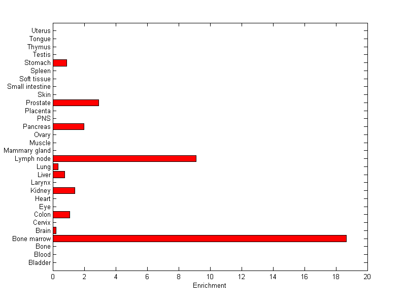 About the profile: The expression level is normalized with tissue-library size. Each value for a gene in a tissue is a ratio of observed ESTs to the expected one in this tissue. The expected number of ESTs is the product of total ESTs of the gene and the fraction of total ESTs in the tissue among all ESTs in 30 tissues. Summary: This gene is preferentially expressed in [bone_marrow, lymph_node] Download: |