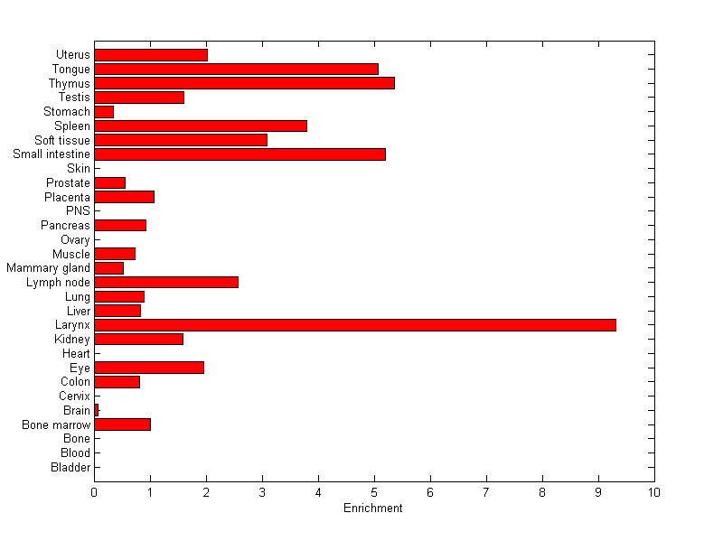 The expression level is normalized with tissue-library size. Each value for a gene in a tissue is a ratio of observed ESTs to the expected one in this tissue. The expected number of ESTs is the product of total ESTs of the gene and the fraction of total ESTs in the tissue among all ESTs in 30 tissues.