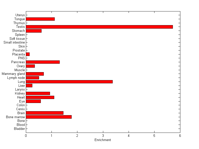 The expression level is normalized with tissue-library size. Each value for a gene in a tissue is a ratio of observed ESTs to the expected one in this tissue. The expected number of ESTs is the product of total ESTs of the gene and the fraction of total ESTs in the tissue among all ESTs in 30 tissues.