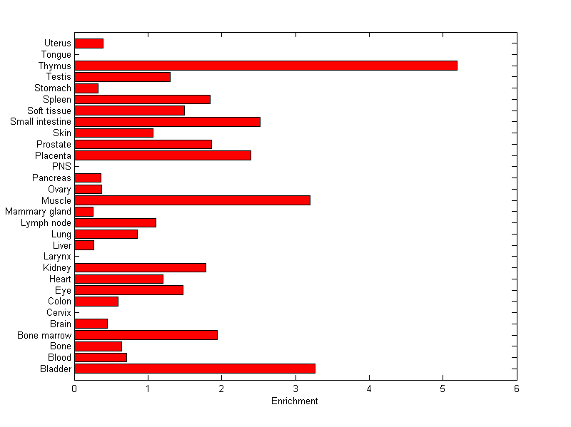 The expression level is normalized with tissue-library size. Each value for a gene in a tissue is a ratio of observed ESTs to the expected one in this tissue. The expected number of ESTs is the product of total ESTs of the gene and the fraction of total ESTs in the tissue among all ESTs in 30 tissues.