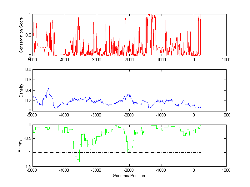 The energy profile (green curve) is about energy for module detection based on TF interaction. The positions with energy less than -1 indicate the existence of CRMs.
