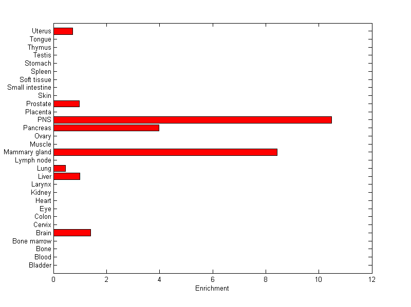The expression level is normalized with tissue-library size. Each value for a gene in a tissue is a ratio of observed ESTs to the expected one in this tissue. The expected number of ESTs is the product of total ESTs of the gene and the fraction of total ESTs in the tissue among all ESTs in 30 tissues.