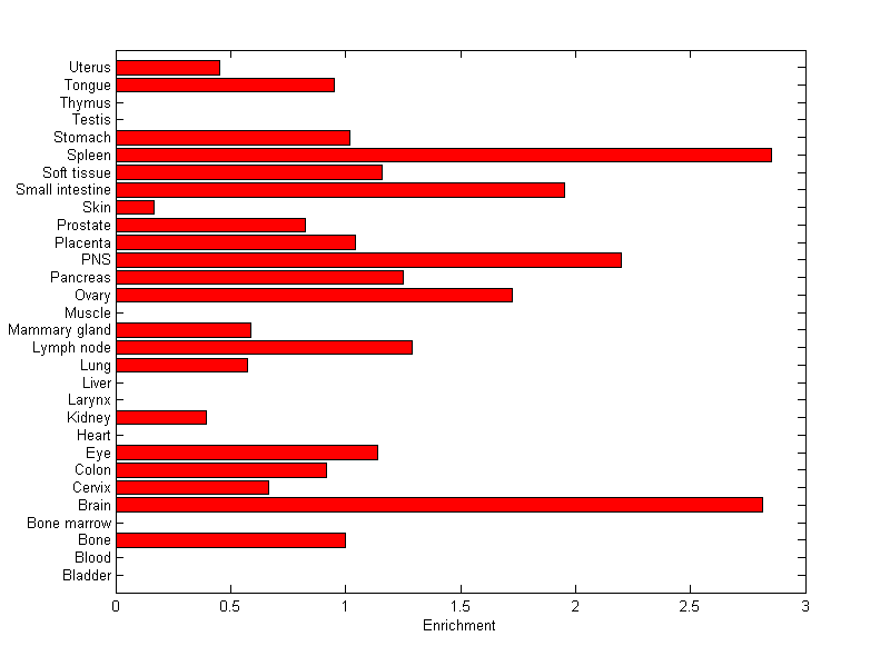 The expression level is normalized with tissue-library size. Each value for a gene in a tissue is a ratio of observed ESTs to the expected one in this tissue. The expected number of ESTs is the product of total ESTs of the gene and the fraction of total ESTs in the tissue among all ESTs in 30 tissues.