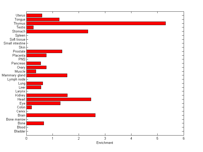The expression level is normalized with tissue-library size. Each value for a gene in a tissue is a ratio of observed ESTs to the expected one in this tissue. The expected number of ESTs is the product of total ESTs of the gene and the fraction of total ESTs in the tissue among all ESTs in 30 tissues.