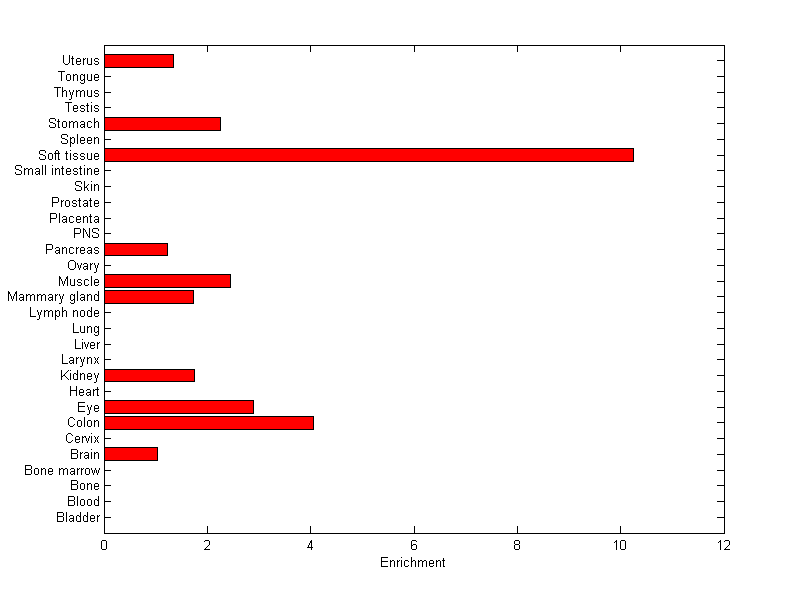 The expression level is normalized with tissue-library size. Each value for a gene in a tissue is a ratio of observed ESTs to the expected one in this tissue. The expected number of ESTs is the product of total ESTs of the gene and the fraction of total ESTs in the tissue among all ESTs in 30 tissues.