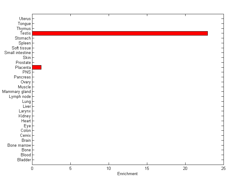The expression level is normalized with tissue-library size. Each value for a gene in a tissue is a ratio of observed ESTs to the expected one in this tissue. The expected number of ESTs is the product of total ESTs of the gene and the fraction of total ESTs in the tissue among all ESTs in 30 tissues.