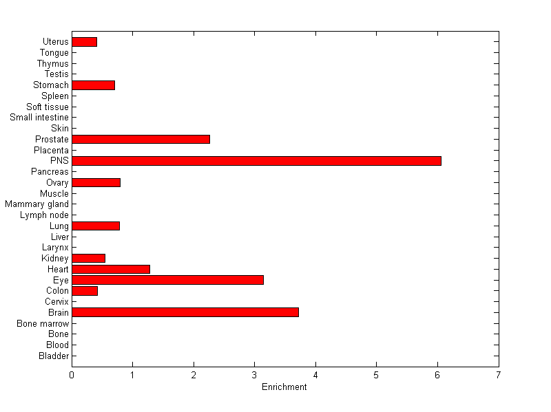 The expression level is normalized with tissue-library size. Each value for a gene in a tissue is a ratio of observed ESTs to the expected one in this tissue. The expected number of ESTs is the product of total ESTs of the gene and the fraction of total ESTs in the tissue among all ESTs in 30 tissues.