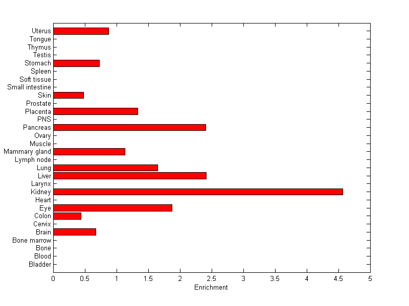 The expression level is normalized with tissue-library size. Each value for a gene in a tissue is a ratio of observed ESTs to the expected one in this tissue. The expected number of ESTs is the product of total ESTs of the gene and the fraction of total ESTs in the tissue among all ESTs in 30 tissues.