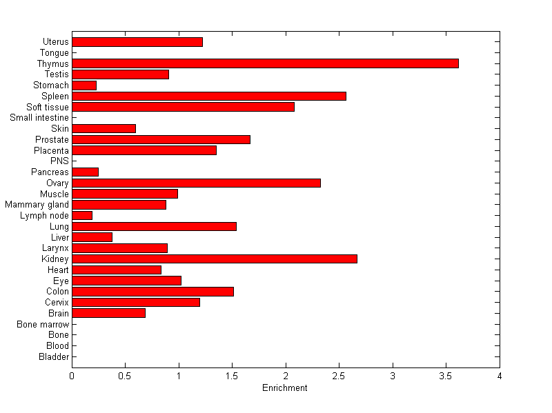 The expression level is normalized with tissue-library size. Each value for a gene in a tissue is a ratio of observed ESTs to the expected one in this tissue. The expected number of ESTs is the product of total ESTs of the gene and the fraction of total ESTs in the tissue among all ESTs in 30 tissues.